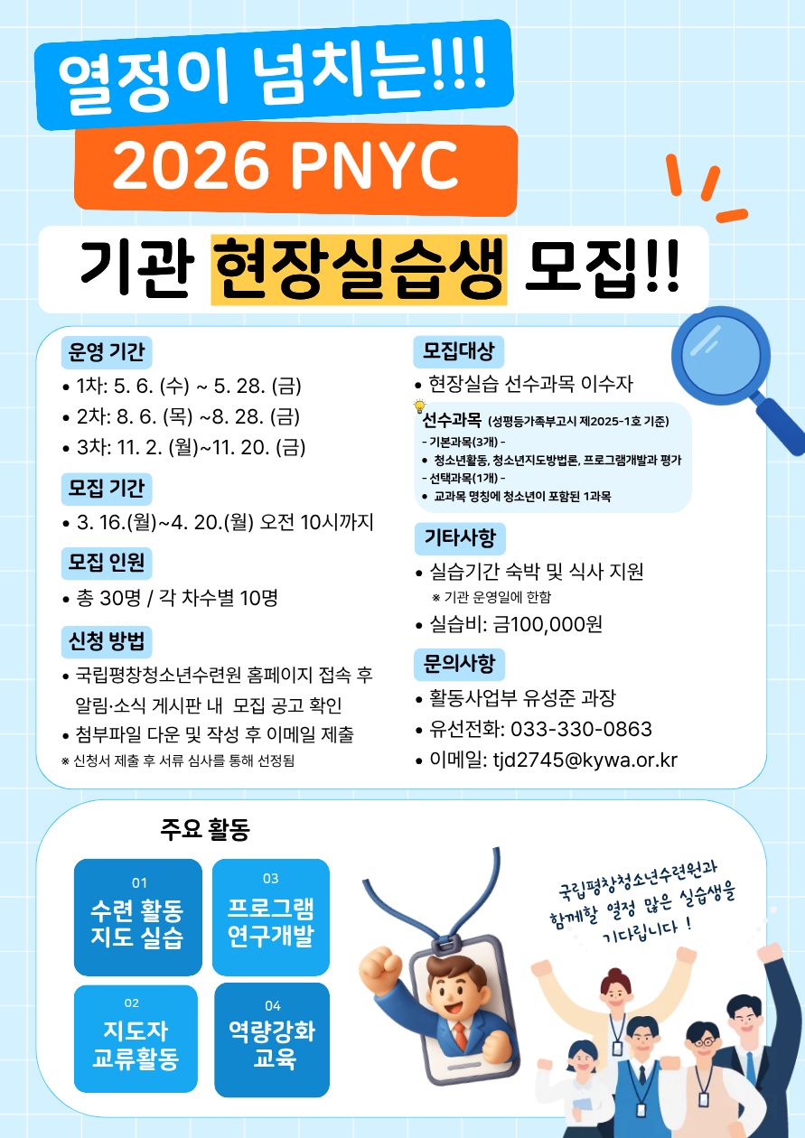 2026년 국립평창청소년수련원에서 함께 할 기관 현장실습생을 모집합니다.